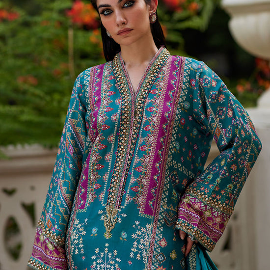 A deep forest green, with eye catching pops of deep is further enhanced with hand embellished pearls and sequins.