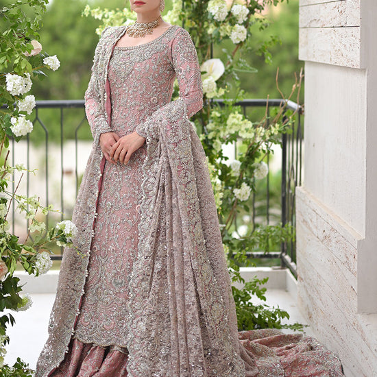 Embrace the dawn of your new beginning with "Aanya," a bridal masterpiece that blends delicate beauty with ethereal elegance. This light pink ensemble boasts a meticulously crafted farshi lehenga, its rich jamawar fabric cascading gracefully in shades of pink. Aanya's magic lies in the intricate dance of light and texture. Silver embroidery adorns the entire outfit, shimmering like moonlight on a blush rose. Each stitch is a testament to age-old craftsmanship, whispering stories of heritage and tradition. The captivating beauty continues with the farshi part of the lehnga. Exquisite pink jamawar, adorned with three shades of appliqué, creates a mesmerizing layer of depth and detail. Aanya is more than just an outfit; it's a timeless expression of love and light. This breathtaking ensemble is perfect for the bride who desires a modern twist on tradition, all while shimmering in the glow of her special day.