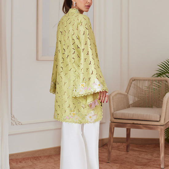 Abigail Kiwi Embroidered Raw Silk Schiffli Kimono Wrap