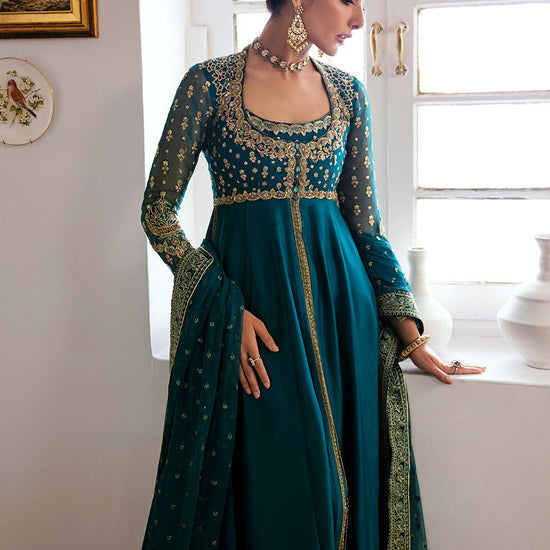 The striking teal kalidaar is the perfectly fuss-free ensemble for any occasion. The richly hand embroidered work on the bodice of kalidaar make this an absolute must have outfit. The delicately embroidered organza sleeves are so very elegant and ideal for any manner of festivity.
