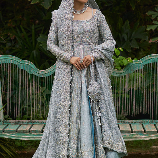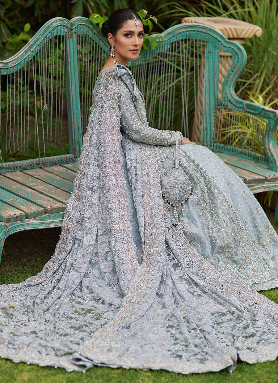 An ethereal shade of ice blue, featuring the most intricate silver embellishment, laden with sparkling diamantes and hand embroidered rosettes.