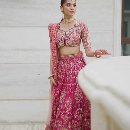 A flowing romantic lehenga choli in an irresistible shade of hot pink — this ensemble captures the essence of festivity with a distinctly FTA touch. The meticulously hand-worked choli sparkles with kora, dabka, naqshi, gota, and resham embroidery, while printed kalis cascade effortlessly from the waist, adding graceful movement and timeless drama. The pure net dupatta, adorned with sitara chan and finished with a delicate zari border, frames the look with understated elegance. But the true showstopper lies in the back — a stunning display of intricate handwork that can even be customized for more coverage.Vibrant, festive, and unforgettable, this piece is designed for the woman who wants her celebration style to feel effortless yet extraordinary.