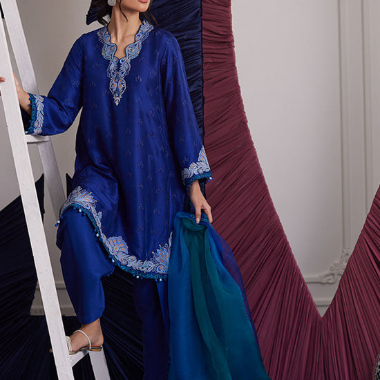 This pure, raw silk blue outfit exudes timeless elegance and intricate craftsmanship. The shirt is adorned with an overall self-schiffli embroidered buti, creating a textured, subtle pattern that adds depth to the design. The neckline, sleeves, daaman, and borders are beautifully highlighted with applique-like embroidery in varying shades of blue, all outlined with crisp white for a clean, sophisticated look. A hint of burnt orange is used strategically as a color breaker, adding a touch of contrast and vibrancy to the ensemble. The shaded organza dupatta, in varying shades of blue, gracefully complements the shirt, finished with a delicate four-sided border that enhances the overall elegance of the outfit. This ensemble is a perfect balance of tradition and contemporary style, ideal for any special occasion.