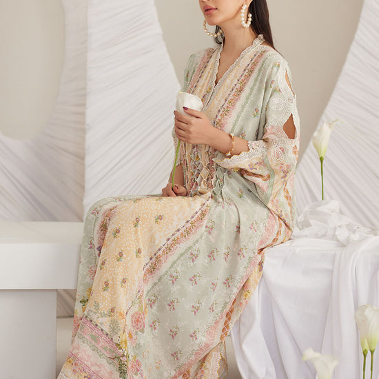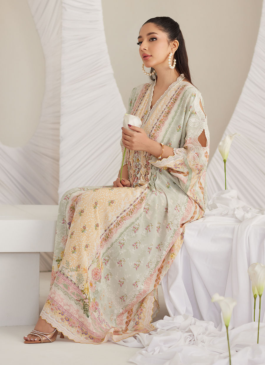 Cut from luxe crepe, Allegra has a pristine ivory and pale mint canvas printed with blissfully delicate florals and signature FTA elements. The floor grazing hem, sharp 'V' neckline and sleeves are all decorated with an ivory border, hand embellished with pearl and silk threadwork floral motifs.
