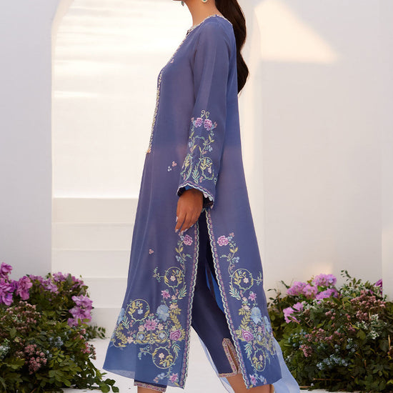 This fresh A-line deep periwinkle shirt paired with a delicate organza dupatta in the same hue is the perfect show stopping outfit to take you from a day event to late night festivities. The shirt, cut from pure raw silk has been adorned with exquisite pastel silk threadwork and hand embellishments. To keep a slight contrast with the the elegant organza dupatta is a slightly lighter hue than the shirt, trimmed with a delicate pastel pink and lavender embroidered border. To complete the look there are pure raw silk, straight leg pants with coordinating embroidered borders. This outfit can be perfectly dressed up with the right statement earrings or it can be dressed down for a minimal look.