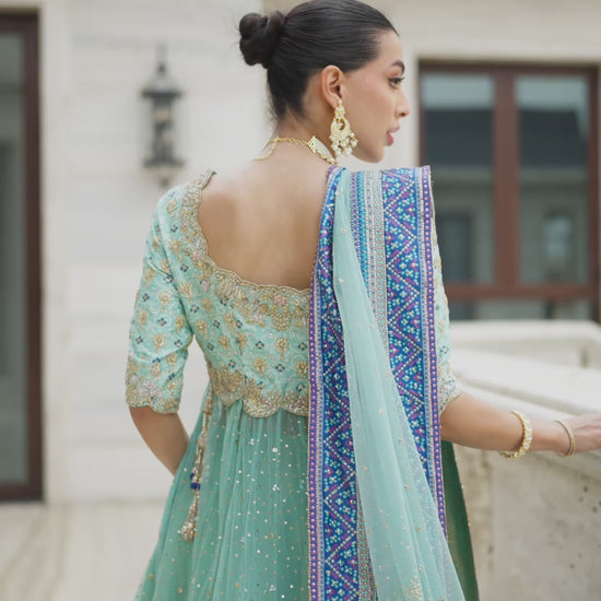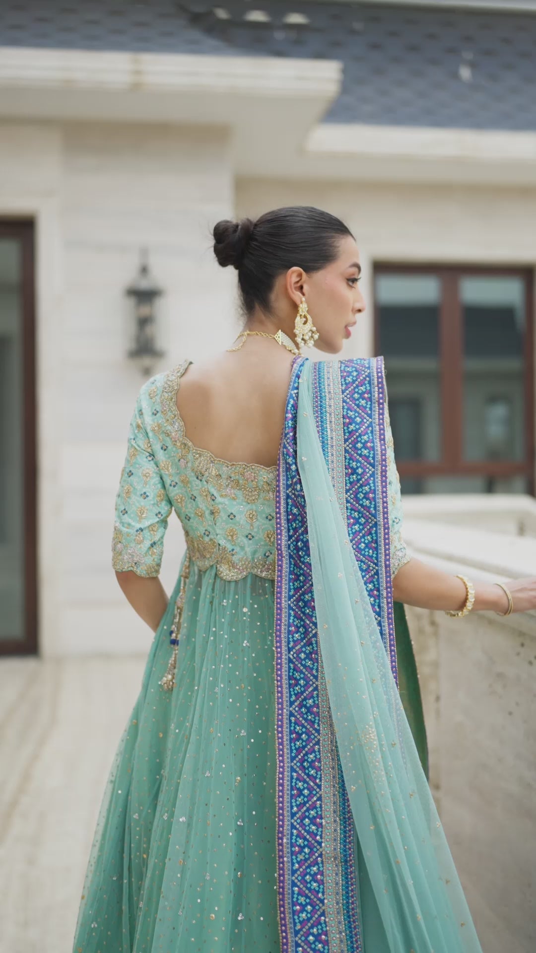 Awash in serene tones of aqua and deep blue ombré, this kalidar ensemble is a vision of fluid elegance. Crafted from net and printed raw silk, the kalidar is intricately adorned with kora, dabka, sequins, crystals, and nakshi, while delicate resham in soft blue and lavender threads adds painterly contrast. A zari silk lehnga grounds the look with its richly embellished border, bringing depth and structure. Completing the ensemble, the aqua net dupatta with its embellished printed border frames the silhouette in understated grace. A harmonious play of color and craft, perfect for celebrations that call for modern sophistication with timeless roots.