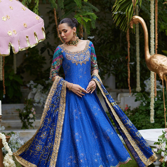 A stunning kalidaar in shades of rich blues, purples and teal adorned with intricate gota embellishments and handwork details using kora, dabka, and sitara. To complete the outfit, a straight pant in a shade of blue is included. This ensemble is a perfect blend of traditional craftsmanship and contemporary design, offering a striking and sophisticated look for special occasions and celebrations. Pair yours with our signature chunri chaddar, made from pure silk (and available in a myriad of hues) drenched in enticingly luminous kaamdaani, as well as an elaborate hand worked border on all four sides. - a striking, versatile choice for any manner of occasion.