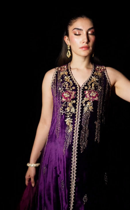 A love letter to understated opulence — this luxurious deep aubergine velvet ensemble is your obvious answer to eternal glamour. The long, front-open silhouette shimmers with exquisite hand embellishments in kora, dabka, nakshi, and tilla, while intricate appliqué work in tonal purple hues, adds texture and depth. Paired with a beautifully dyed pure medium silk dupatta and a matching raw silk izaar, this look radiates regal sophistication.