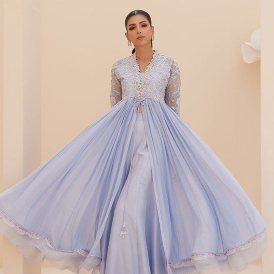 Powerfully chic and undeniably glamorous, this ensemble is your modern style solution.The bodice of this luxuriously, flowing kalidaar is generously hand worked created to steal the moment – be it day or night.A stunning wedgewood blue canvas of pure raw silk is brought to life with pastel silk thread work as well as silver, pearl and bead hand embellishments. The outfit can be paired with striking lehenga, this is one of those fail safe ensembles certain to make you the belle of any ball! Style yours with statement earrings and your hair up to bring attention to the gorgeous neckline and bodice.
