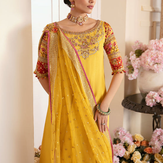The round neckline and hand block printed sleeves are intricately hand worked with glimmering gold gota, nakshi, sequins and dabka. The kalis cascade down from the heavily neckline adding graceful movement and that unforgettable drama.