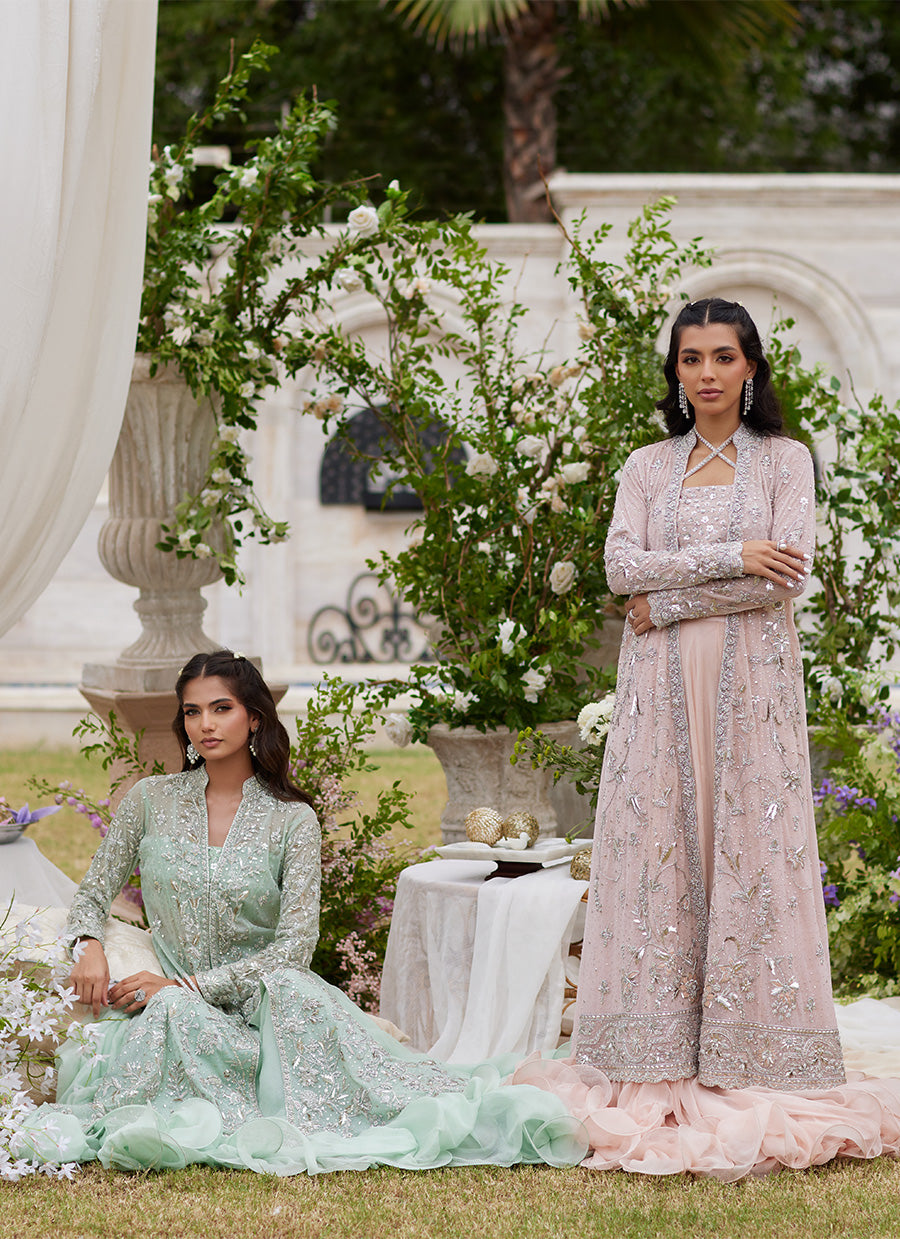 Soft and romantic, this pale blush ensemble captures the essence of modern elegance. The sheer net jacket shimmers with mukaish, kora dabka, sequins, and crystals, creating a play of light across its surface. Beneath, a zari silk bustier is delicately adorned with tiny zardozi florals, adding subtle intricacy. The 25-yard chiffon lehnga flows with ethereal ease, bringing volume and movement to the silhouette. A look that is airy yet opulent — perfect for celebrations that call for quietly stealing the spotlight