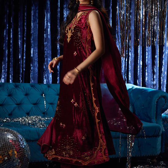 Rich, refined, and effortlessly elegant — this Garnet-red ensemble captures the essence of festive luxury. This straight velvet shirt is exquisitely adorned with zari borders, tilla, nakshi, sequins, pure silk threadwork, and delicate stone work, creating a stunning interplay of texture and shine. The look is elevated with a pure medium silk dupatta finished with gota and velvet trims, paired with a raw silk izaar featuring elegant zari borders. An ensemble that’s timeless yet striking — perfect for evening soirées and celebratory gatherings alike.