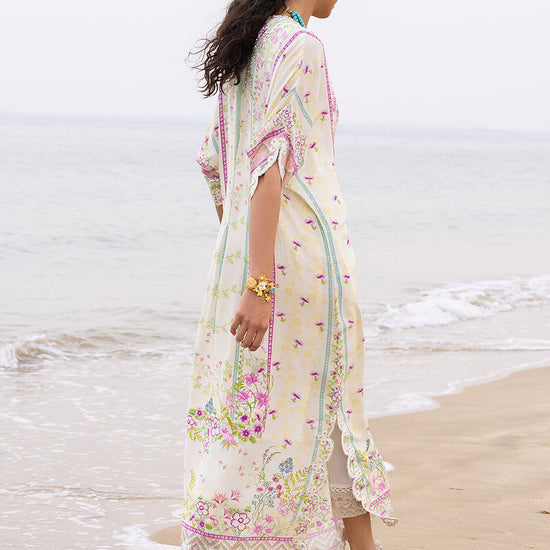 Cut from fluid, breathable crepe silk, Ariel is a pristine ivory printed with blissfully delicate florals and signature FTA elements. The floor grazing hem, sharp 'V' neckline and sleeves are all decorated with an ivory border, hand embellished with pearl and silk threadwork floral motifs.