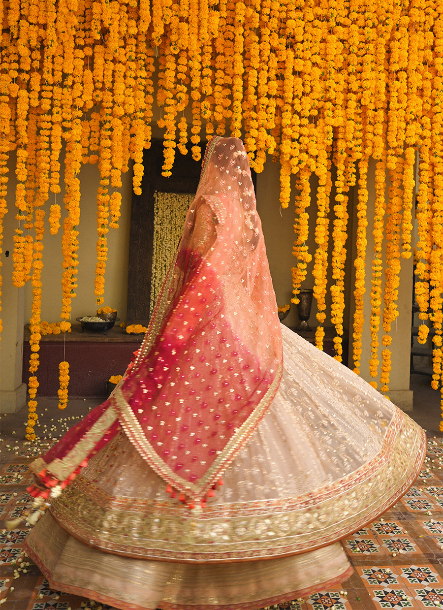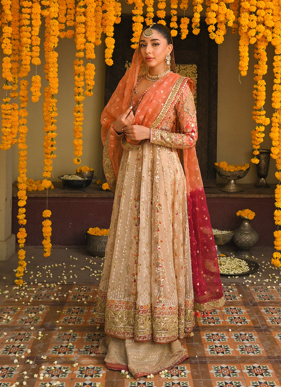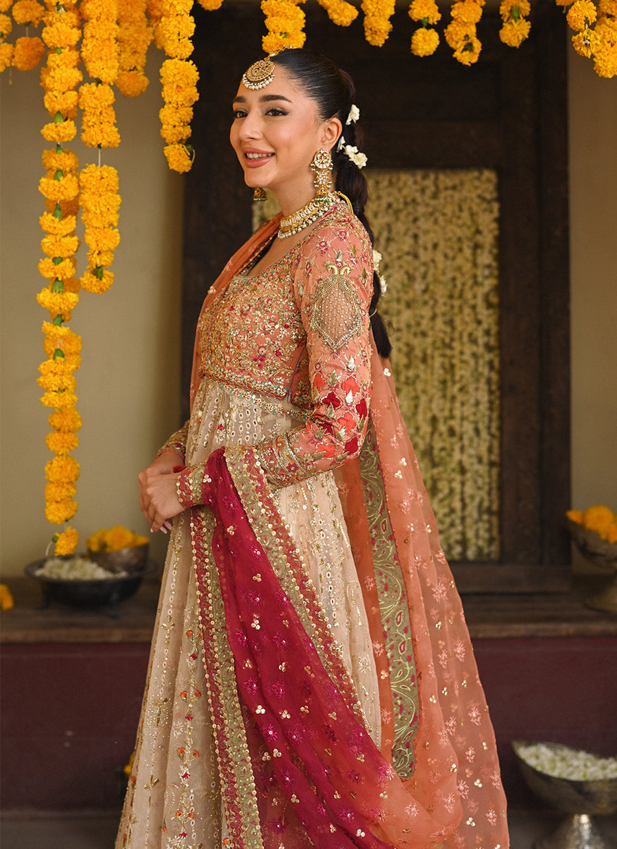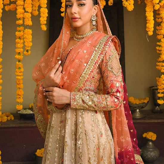 A stunning dull gold organza angrakha, embellished with intricate threadwork and hand embellishments. The angrakha features a hand worked coral bodice adorned with appliques in shades of red, creating a rich and textured focal point. A block printed border adds a traditional touch to the garment, while a hand blocked border further enhances its elegance. The angrakha is paired with a dull gold jamawar lehenga, complementing the hues of the angrakha and finished with a rust jamawar fabric that adds depth and richness to the ensemble. Completing the outfit is a net dupatta in shades of coral and maroon, embellished with sitara chann all over for a subtle shimmer. The dupatta is beautifully finished with a zari border that adds a regal touch and tassel finishing’s on the corners, providing a playful and festive finish to the ensemble. This ensemble is perfect for special occasions where you want to exude elegance and sophistication with its intricate detailing, rich colors, and luxurious fabrics. style tip; pair the outer choli with the lengha and drape the dupatta across for a different look.
