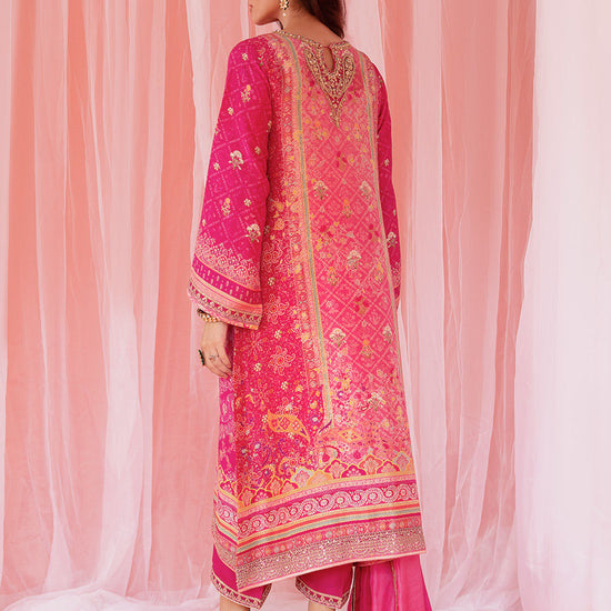 The gorgeous two-tone, pure medium silk dupatta with gota trimmings adds a graceful flair to your outfit.