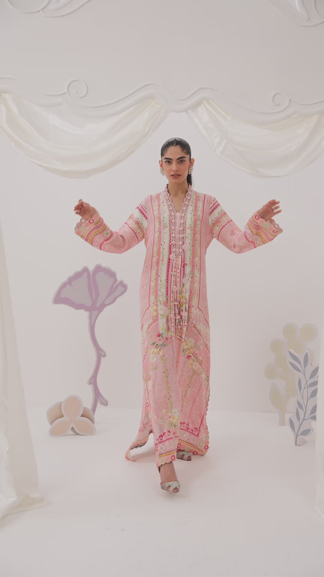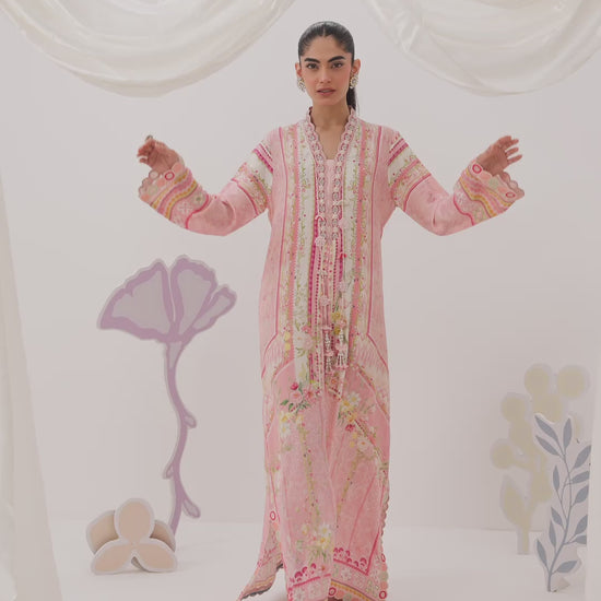 The gentle play of pastel florals and borders enhances the kaftan’s natural fall, making it a versatile choice for festive occasions where comfort and sophistication go hand in hand. Easy to wear yet thoughtfully detailed, Aurette is a statement piece that feels composed, graceful, and unmistakably elevated.