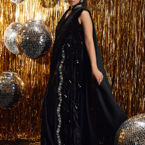 Alternatively, you layer this statement making jacket over a sleek, black pure Charmeuse saree for a dramatic, scene stealing look.