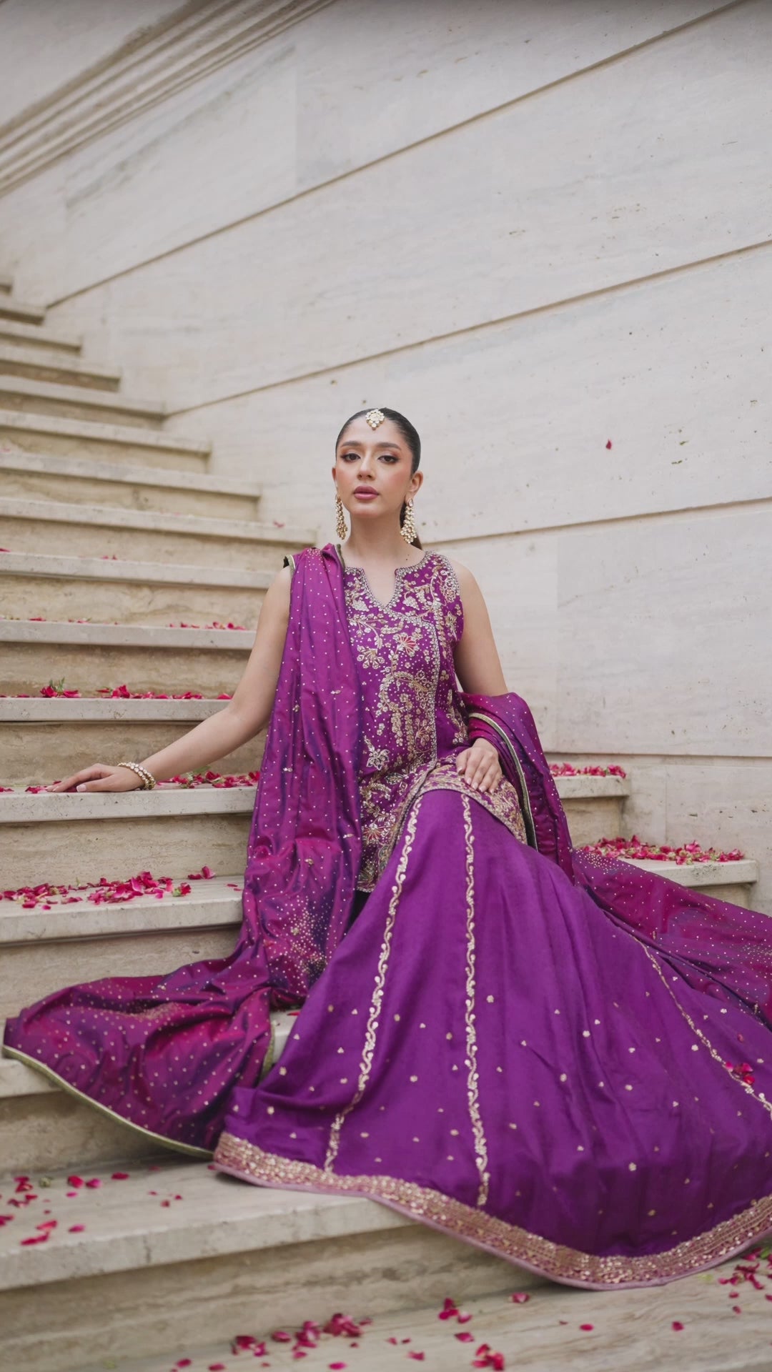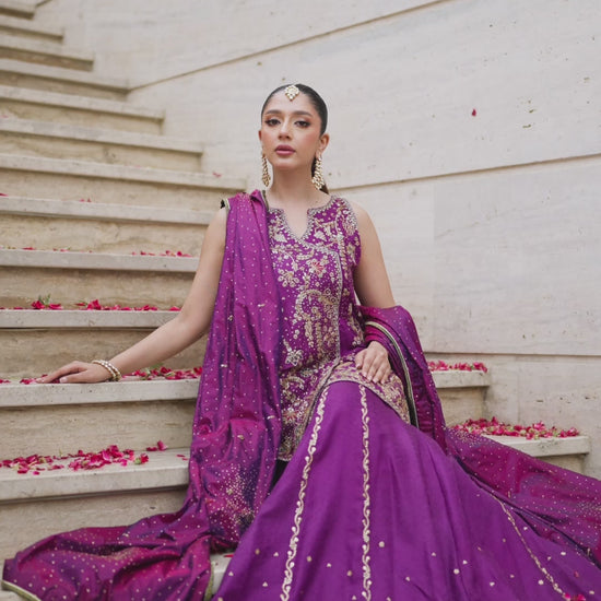 Striking yet graceful, this wonderful orchid angarkha purple is brought to life with layers of intricate handwork—kora, dabka, sequins, and crystals shimmering against appliqués in lush green tones. Its short silhouette flows into a raw silk dhaka pajama, lightly embellished for structure and ease. The two-toned katan dupatta, scattered with chan, frames the look with soft charm. A perfect balance of bold color and delicate craft, this ensemble captures sophistication with a modern edge.