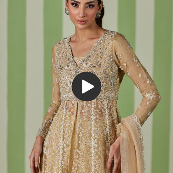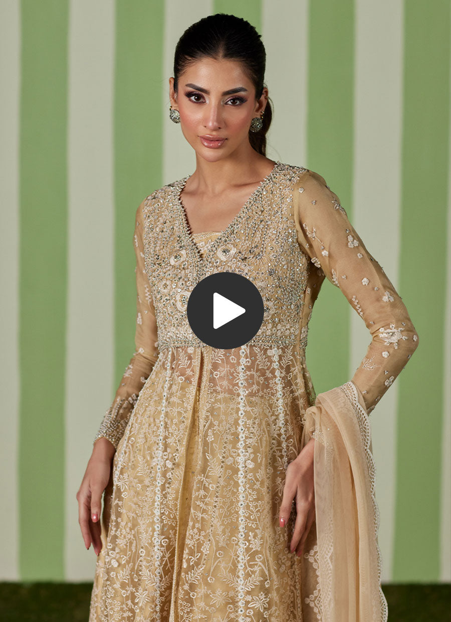 Eid dressing just got a main-character upgrade — Ayra is pure festive romance. This dreamy kalidaar silhouette is crafted in a warm golden-beige tone, beautifully embroidered all over with delicate floral and vine patterns that feel timeless yet statement-making. The look is elevated with intricate detailing on the bodice and sleeves, finished with elegant borders that add volume, movement, and that unmistakable FTA luxury. Ayra is the perfect pick for Eid day, family gatherings, and any moment that deserves a little extra sparkle.