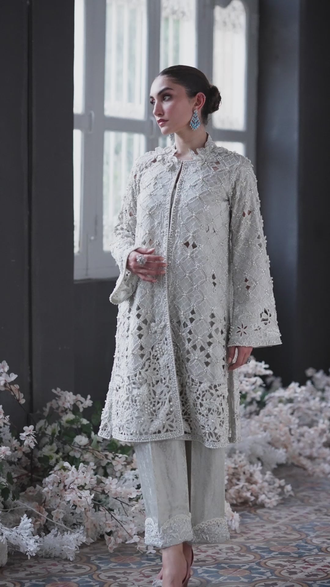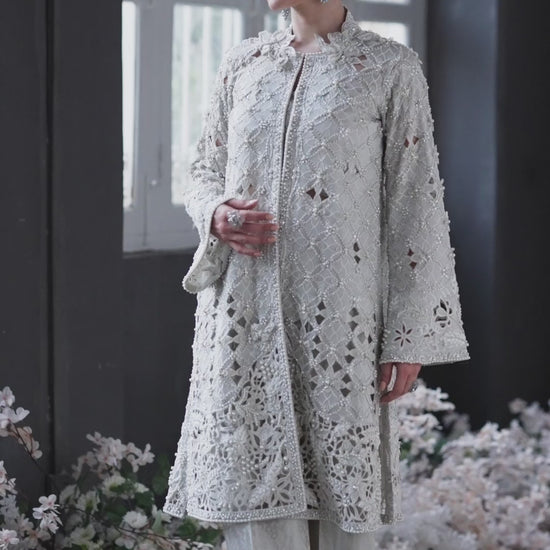 A statement in modern regality, this front-open jacket in a sophisticated silvery hue is crafted from luxurious pure zari fabric. The design features intricate cutwork embroidery, beautifully embellished with pearls, beads, cut-dana detailing, and delicate 3D floral accents. Full-length sleeves and a high neckline lend an air of timeless elegance, while the exquisite handwork adds a contemporary edge.
