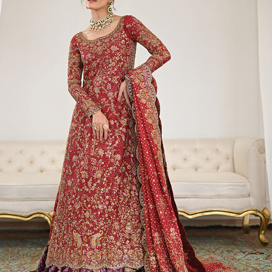 The meticulously selected unique shade of scarlet is the bridal color of the season. The voluminous straight shirt that has a wide heavily embellished daaman comes with high slits and ultimately makes it the most flattering silhouette for a bride. The pure cotton net shirt is beautifully embellished with intricate gold zardozi, dabka, sequins, and silver zari, naqshi, gota. Heavy on the traditional mukesh and kamdani this look is truly the one that will stand out this season. It has a heavy floral trellis on the front and back which gives the bride regal feels. This elegant shirt is complemented with a farshi lengha made in gold jamawar with heavily worked shades of royal purple pure raw silk for the goth. The lehenga in pure jamawar is embellished with delicate and beautiful gold handwork done by our expert artisans. The exceptionally beautiful bridal is an absolute showstopper. The dupatta features a heavily intricate border which gives the dress a fancy finish that will no doubt leave everyone amazed. The perfect combination of colors makes it a unique outfit which will give the bride a gorgeously royal look.