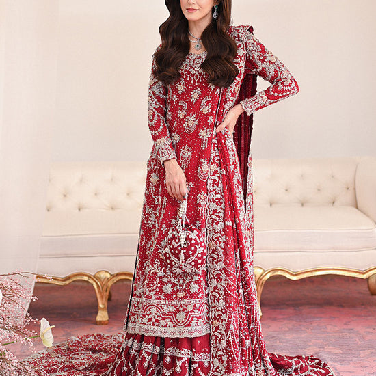 This FTA Red bridal is a stunning heritage ensemble. This meticulously picked deep-red pure cotton-net beauty is emblazoned with intricate silver naqshi, kora, dabka and Swarovski crystals. The one-of-a-kind traditional hand embellishment has this stunning piece sparkling flawlessly this season.