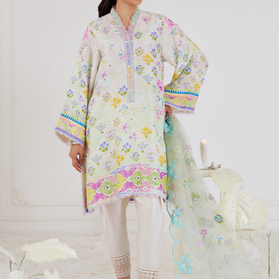 The short shirt is paired with an organza dupatta in coordinating aqua is embroidered with vibrant blooms in soothing sorbet hues and finished with a romantic, scalloped border. Pair yours with our pure raw silk shalwar as shown and statement earrings to breeze through summer festivities.