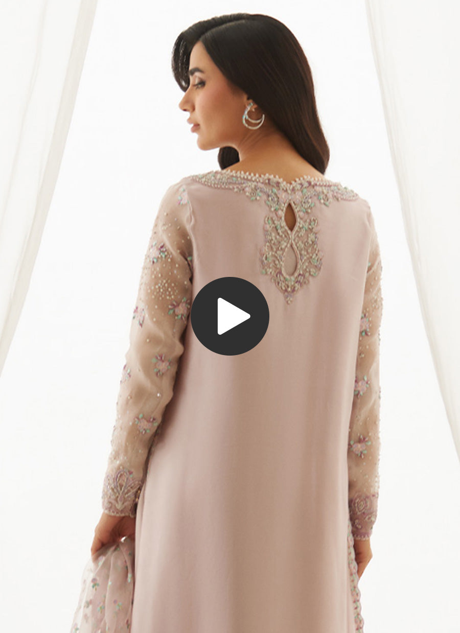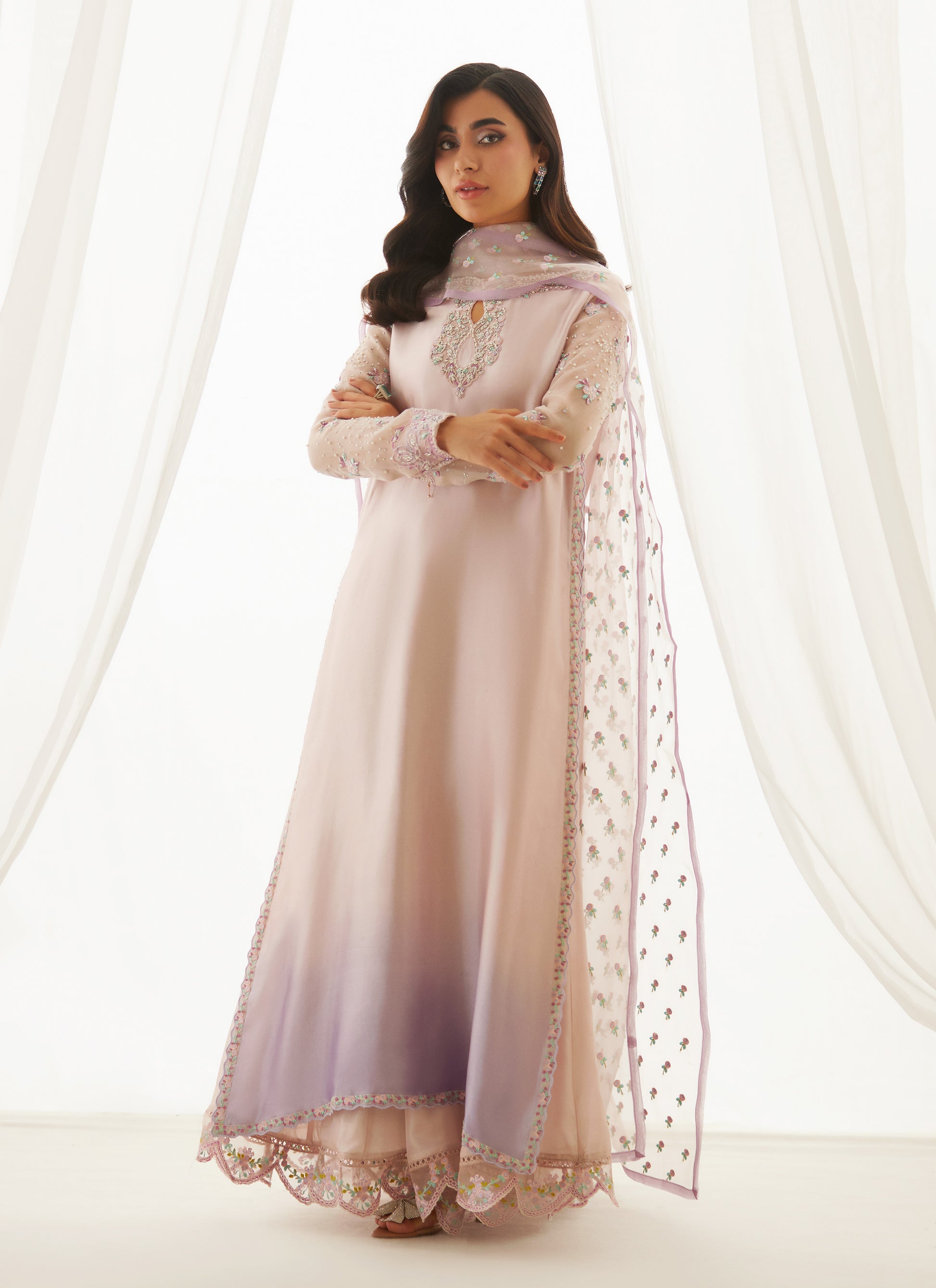 A vision in pale, silvery lavender that deepens into a rich tonal hue, adorned with composed silver and pearl embroidery. Delicate florals trace the neckline, while sleek organza sleeves shimmer with scattered sequins. Paired with an ethereal organza dupatta finished with intricate borders, this ensemble is eternally stylish, refined, and brimming with irresistible details.