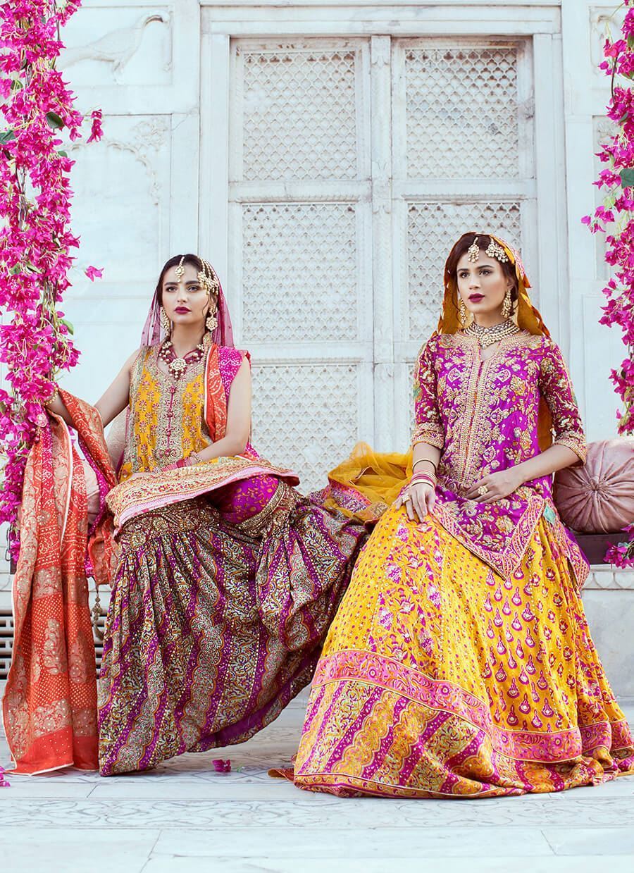 Look tantalizingly elegant in this delicately embellished bridal couture. A short pink shirt worked in gotta and zari. The block print panelled lehnga is finished with a worked multi-colored border. It comes with a net dupatta.