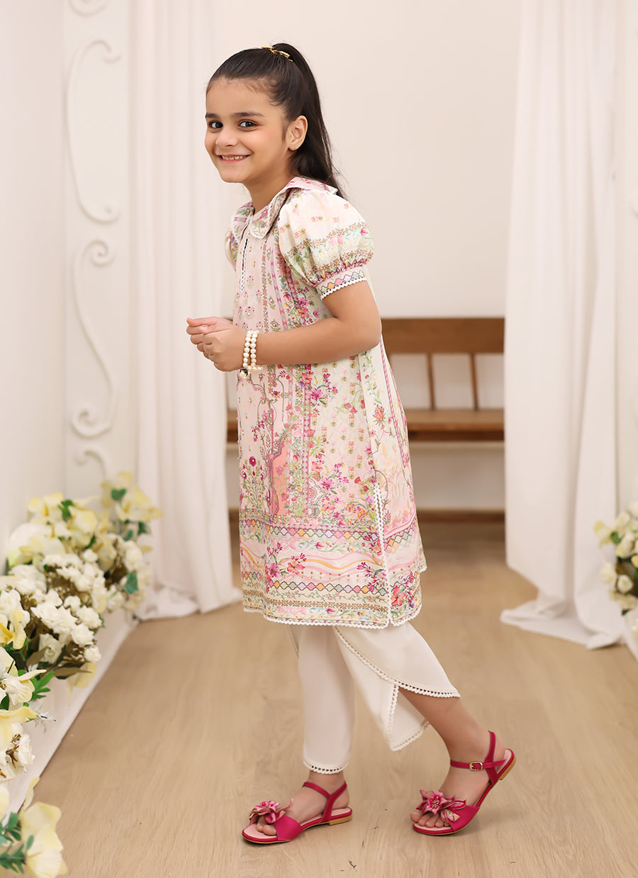 This sumptuous raw silk kurta for young girls is a stunning blend of elegance and whimsy. The shirt is printed with whimsical florals that bloom daintily all over the shirt, making this an absolute must have. The sleeves are finished with stunning embroidery