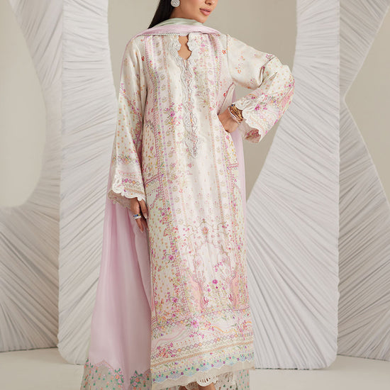 Cut from sumptuous raw silk, the shirt is printed with whimsical florals that bloom daintily all over the shirt, making this an absolute must have. The relaxed, much loved silhouette has a universally flattering neckline, adorned with delicate hand-made floral motifs, pearls and sequins, adds an easy timeless elegance. The sleeves are finished with stunning embroidery. The graceful, relaxed fit shirt is paired with a pure medium silk dupatta in coordinating ivory and blush pink trimmed with organza borders embroidered with vibrant blooms. Pair yours with pure raw silk pants as pictured