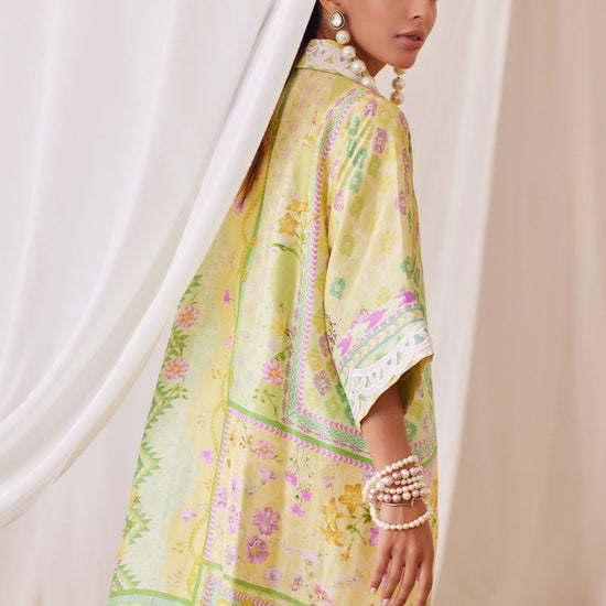 Irresistibly romantic florals, luxe fabrics and captivating details for the ultimate wardrobe reset!! Cut from sumptuous raw silk, the lemon and pink shirt dress is printed with whimsical florals paired with geometric elements, designed to catch the eye over and over, making this an absolute must have. The relaxed, much loved silhouette has a universally flattering round neckline, while the sleeves adorned with ivory silk thread work makes this outfit feel like a dream. Pair yours with pure raw silk pants (as shown) to breeze through any and all festivities.