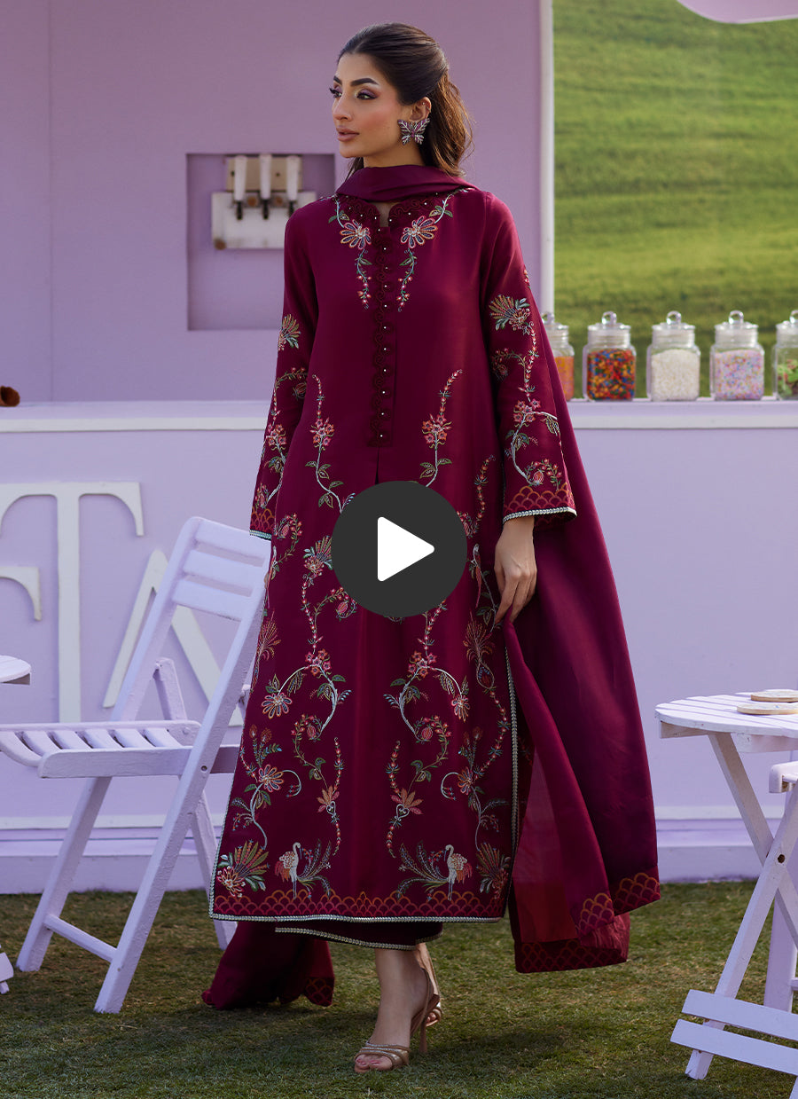 A true head-turner in the most effortless way — Caire is your ultimate statement staple for festive season. Crafted in a rich deep maroon raw silk long shirt, this look is elevated with delicate embroidered motifs scattered all over, and a beautifully detailed neckline finished with subtle embellishment for that perfect hint of shine. Paired with a matching medium silk dupatta, finished with a refined embroidered border, Caire feels polished, graceful, and endlessly wearable. Completed with a raw silk izaar featuring a coordinating embroidered hem, this ensemble is perfect for Eid dinners, intimate daawats, and those “I want to look stunning without trying” moments.