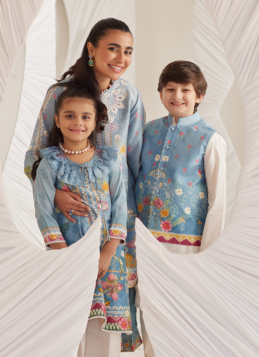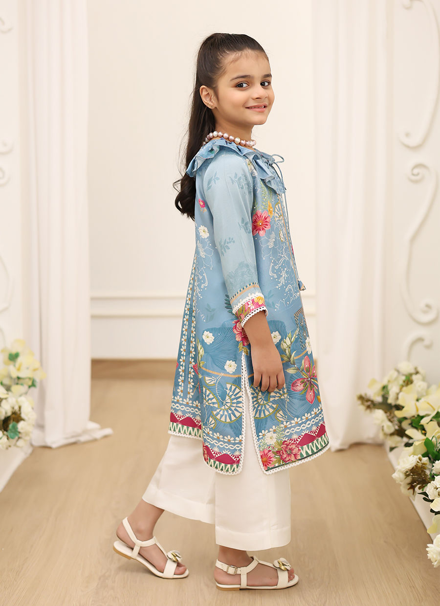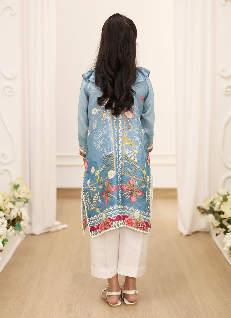 This slate blue printed raw silk kurta for young girls is a stunning blend of elegance and whimsy. The rich slate blue fabric is beautifully adorned with a delicate, subtle print, creating a sophisticated yet playful look. The kurta is highlighted by a striking puffy collar that adds a touch of drama and youthful charm, giving the outfit an elevated, fashion-forward feel. With its comfortable, relaxed fit and delicate detailing, this kurta is both a stylish and practical choice for any young FTA girl who loves to shine.