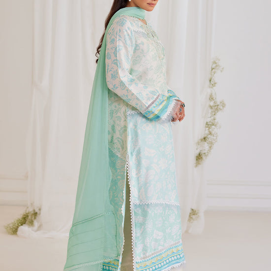 The graceful relaxed fit shirt is paired with an aqua, pure chiffon dupatta with organza detailing.