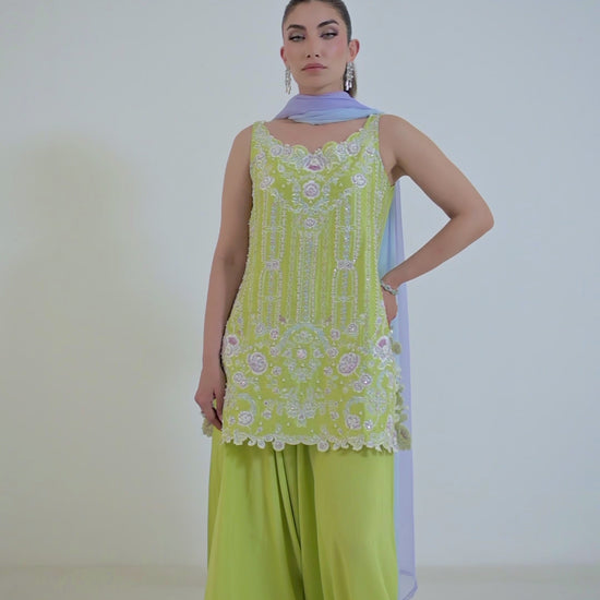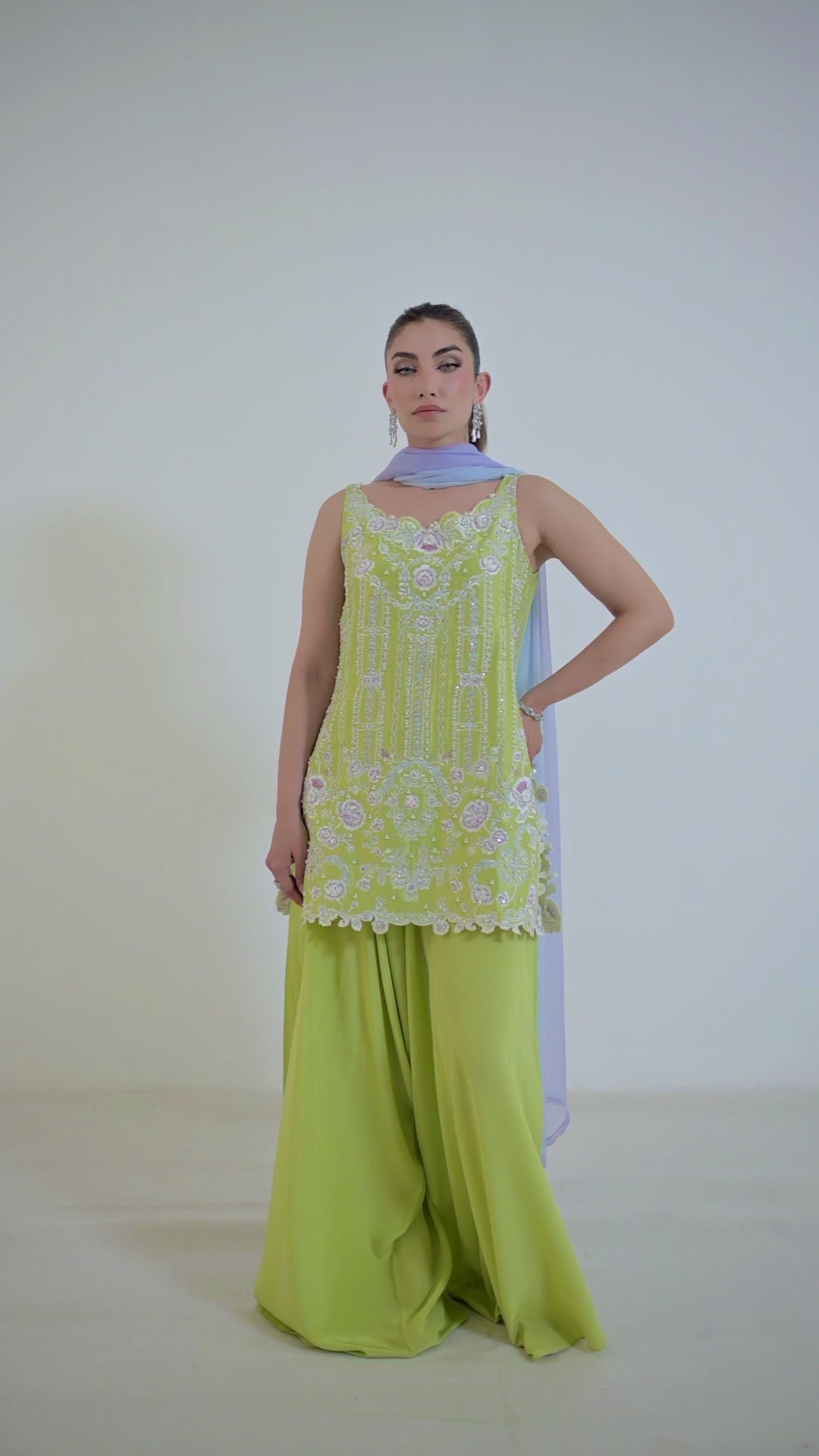 A zingy lime green ensemble that blends tradition with contemporary cool — a richly embroidered shirt, cut from pure raw silk, paired with fluid draped pants and a soft chiffon dupatta edged in lace. Effortless, chic, and made for every celebration.