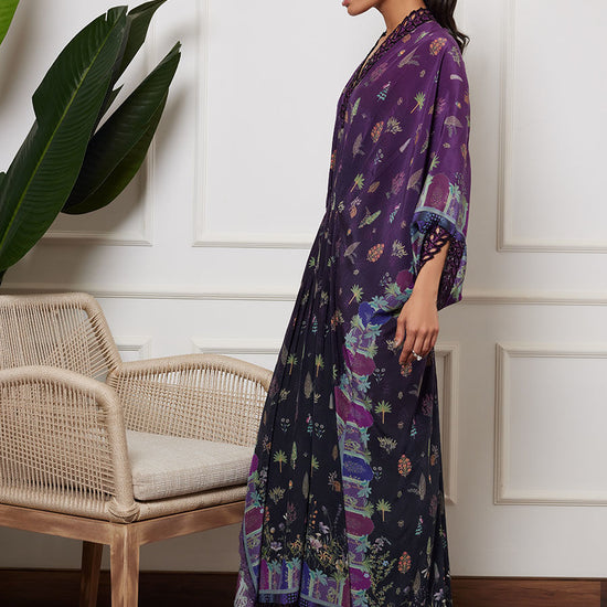 Cut from soft breathable crepe silk, Chione is a deep aubergine that smoothly flows into a deeper hue to bring that drama! Printed with blissfully delicate florals and signature FTA elements, this kaftan is your easy choice for any occasion. The floor grazing hem, sharp 'V' neckline and sleeves are all decorated with a coordinating aubergine cutwork border, hand embellished for a subtle shine to catch the eye, over and over.