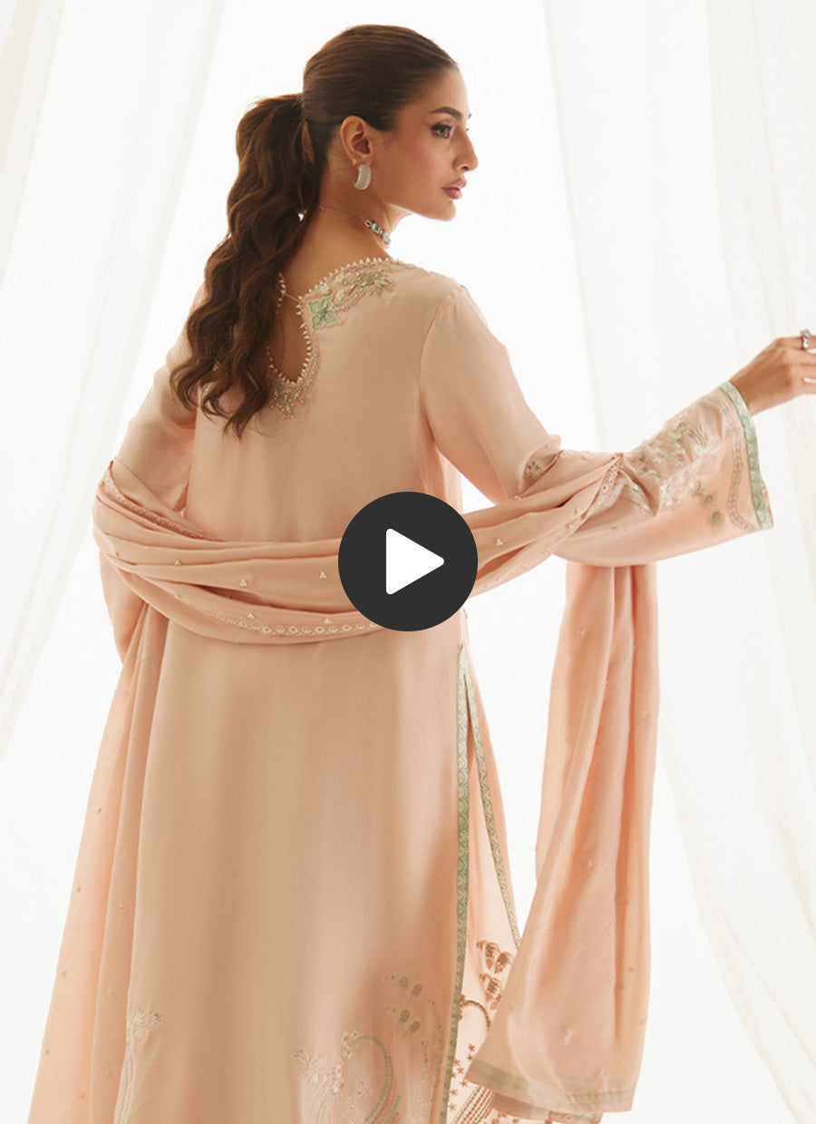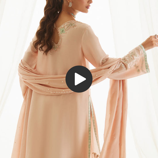 A symphony of softness and sophistication, this ensemble is crafted from the finest pure peach raw silk. The long kurta is meticulously embroidered in pastel tones with off-white, creating an aura of quiet elegance. An aqua embroidered border frames the silhouette, lending a refreshing contrast that highlights its fluid grace. Paired with a tailored pure raw silk izaar, the look balances tradition with refinement. The ensemble is completed with a medium silk dupatta, edged with delicate embroidery, adding a final whisper of artistry. A timeless expression of poise and femininity.