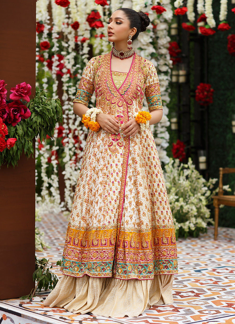 The Cyra Kalidaar is a stunning display of Farah Talib Aziz’s mastery over seamless use of colour. A pristine ivory silk base is emblazoned with the classic FTA block print, further hand-embellished with gota, Resham thread work, naqshi, zari, Swarovski crystals and sequins.