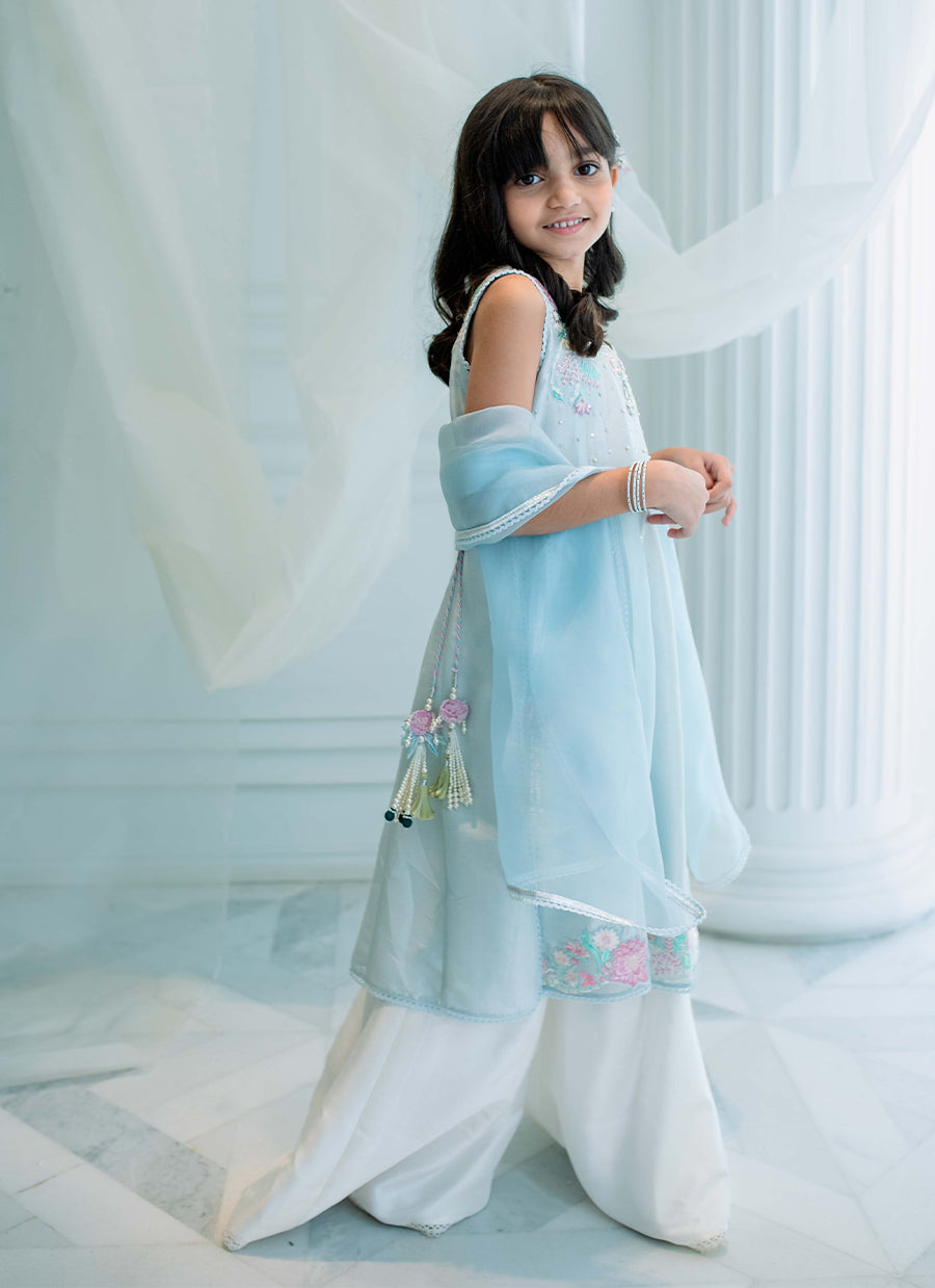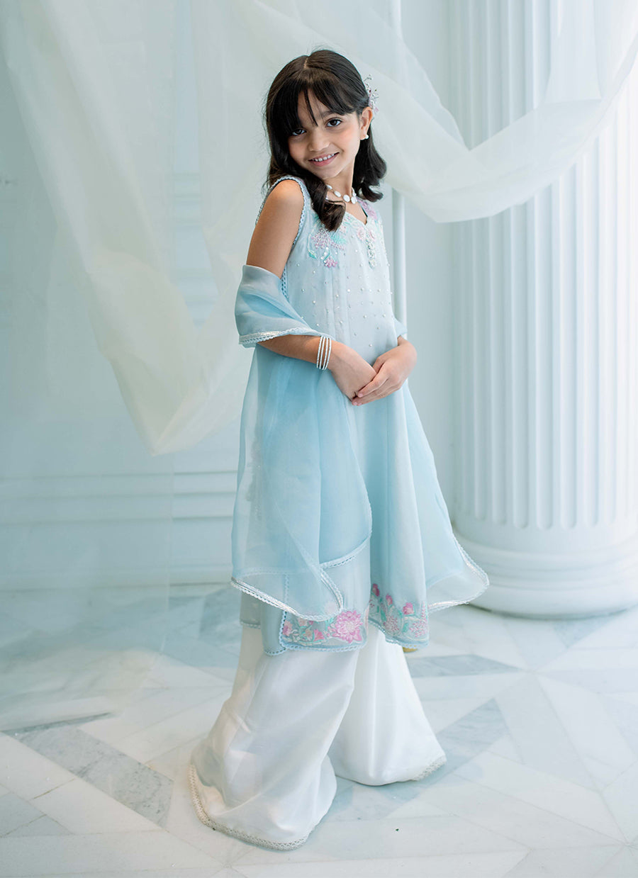 The perfect princess addition to your little girls wardrobe. Cut from pure silk, this gorgeous ensemble, in an icy blue hue, is going to be your perfect solution for all special occasions. Hand encrusted with an array of delicately shimmering Swarovski crystals, pearls and sequins on the front and back neckline. Delicate silk thread work in dreamy pastel hues adorns the neckline and daaman. A floaty diaphanous organza dupatta is trimmed with delicate silver gota, adds a fun flair to the final look. Cute captivating details will have heads turning for a second look!! Pair the ensemble with our mini pure silk pants (as shown) and some cute hair accessories to make your little girl the belle of any ball!