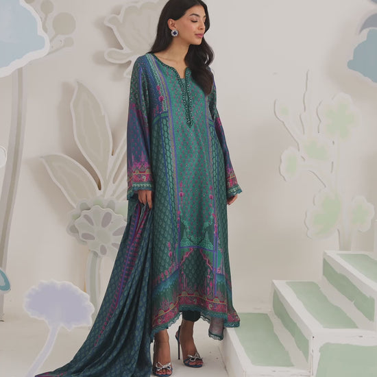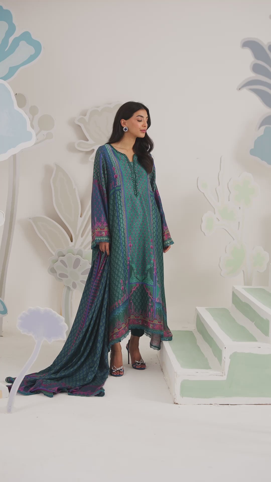 Paired with a solid raw silk izaar and complemented by a printed medium silk dupatta, this ensemble strikes a perfect balance between tradition and modern sophistication. Lightweight yet luxurious.