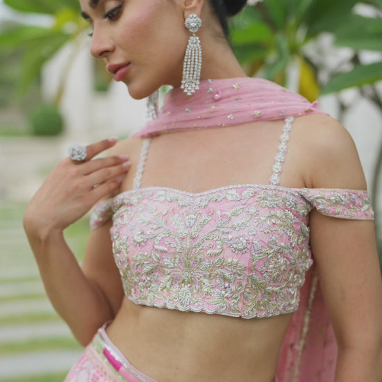 In a cool shade of pink, this ensemble radiates modern femininity with timeless charm. The pure raw silk choli is richly adorned with silver and champagne embellishments, elevated with a graceful shoulder drop and a butterfly-inspired motif delicately gracing the back, a poetic detail that adds whimsy to its elegance. The look is paired with a voluminous lehnga, its surface alive with deep pink accents, intricate embellishments, and sunburst chan booti, creating layers of texture and movement. Completing the ensemble, a pink net dupatta is scattered with tiny floral bootis and chan, finished with golden kingari edging that lends a soft radiance. Romantic and refined, this creation celebrates bridal artistry with a perfect harmony of playful detail and graceful sophistication.
