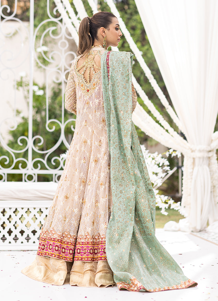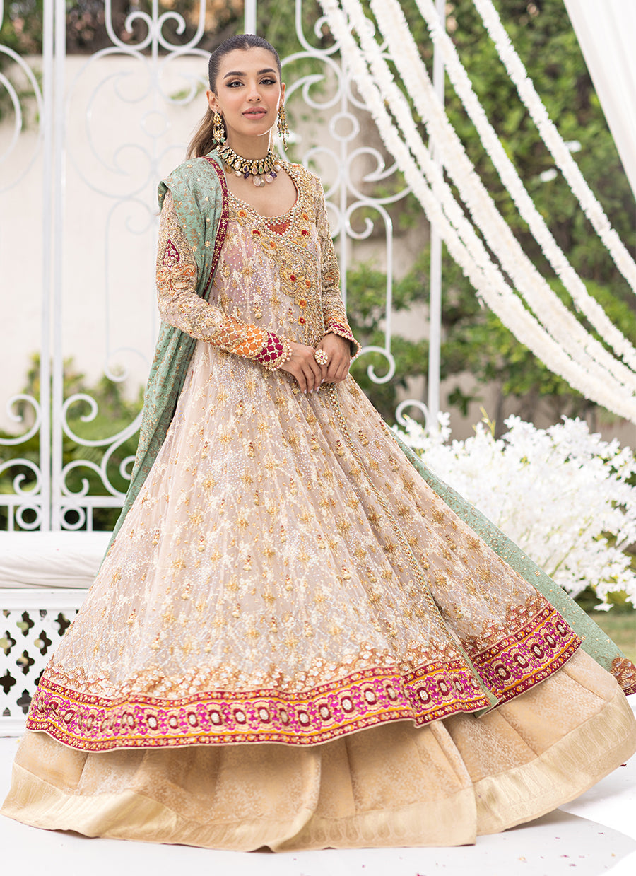 The perfect nude toned tulle, adorned with a delicately glimmering, hand embellished neckline, layered over a delicate embroidered trellis. Kora, dabka, Swarovski crystals, silk thread work, sequins and gota. The scene stealing kalidaar is worn over a striking block printed choli.
