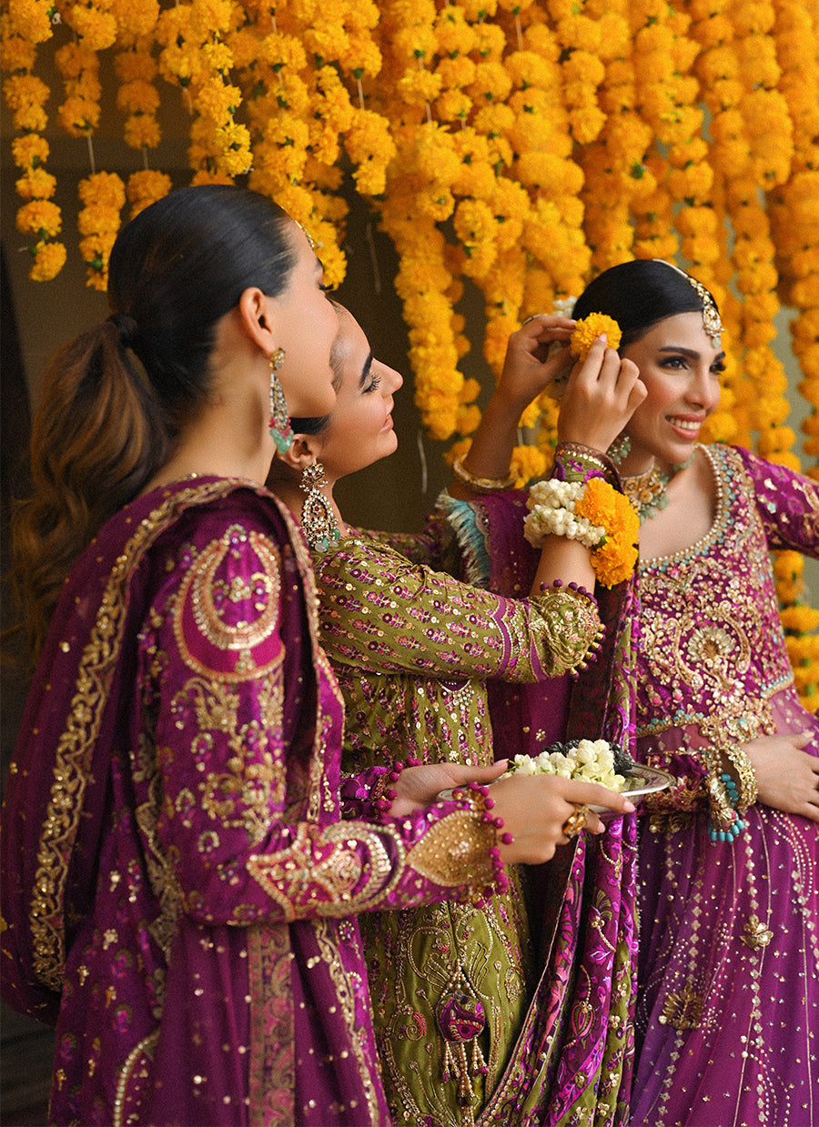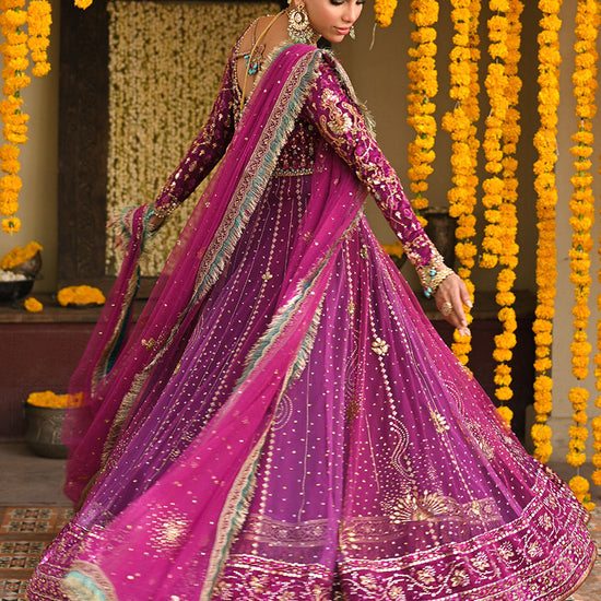 If you want to stand out while dancing, this voluminous kalidaar will certainly be a stand out choice! A stunning kalidaar in shades of rich purples, adorned with intricate gota embellishments and handwork details using kora, dabka, and sitara. The kalidar combines a hand-blocked bodice with net kalis in various shades of magenta, creating a dynamic and visually captivating effect. Paired with the kalidaar is a magenta net dupatta embellished with sitara chann all over, adding a subtle sparkle and elegance. The dupatta is beautifully finished with a golden kiran all around, enhancing its grace and completing the ensemble with a touch of luxury. To complement the outfit, a lehenga in harmonious shades of magenta is included, featuring a hand-blocked border that ties together the colors and motifs of the ensemble seamlessly. This ensemble is a perfect blend of traditional craftsmanship and contemporary design, offering a striking and sophisticated look for special occasions and celebrations.