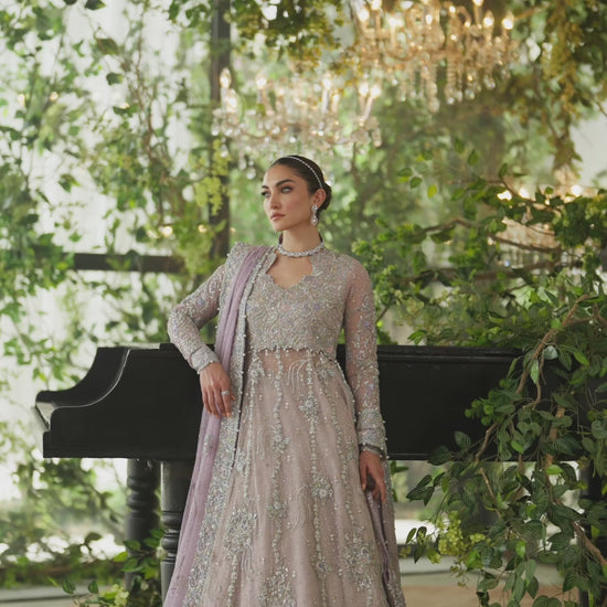 Delicate, regal, and intricately crafted — this lilac kalidaar is a celebration of timeless tradition reimagined in a soft, romantic hue. Crafted from pure net, the kalidaar features a heavily embellished bodice and gracefully flared panels, adorned with classic kora, dabka, and nakshi work that lends depth and dimension to its ethereal silhouette.