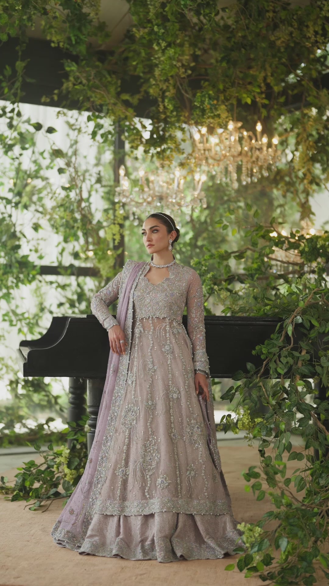 The ensemble is completed with a lavender pure net dupatta, detailed with a subtle resham-embroidered border in soft tones, and a generous scattering of chan booti and flowing curvilinear motifs. The result is a beautifully balanced look that combines structure, movement, and artisanal finesse — perfect for wedding festivities or formal celebrations.