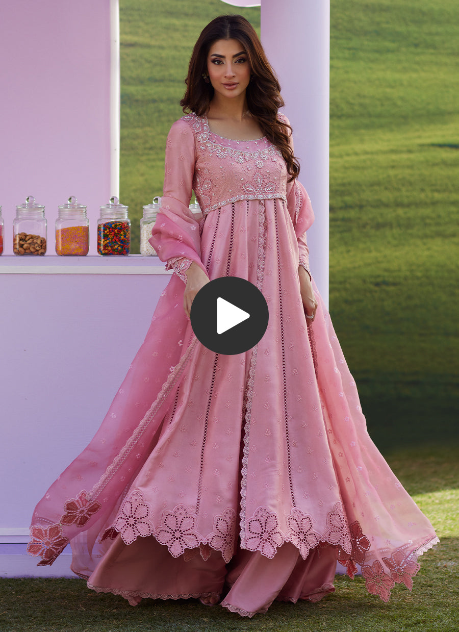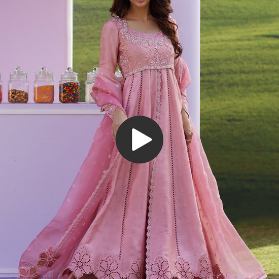 The ultimate Eid showstopper — soft, romantic, and made to steal every spotlight. Elara Rose is crafted in a dreamy dusty pink raw silk, featuring an embroidered kalidar silhouette with a delicate schiffli body, beautifully enhanced with appliqués and intricate handwork using pearls, crystals, and 3D florals. Paired with a luxurious raw silk lehnga, the look is completed with a breathtaking dyed organza dupatta in soft shades of pink, adorned with sequin embroidered buti all over for that perfect festive shimmer. Perfect for Eid celebrations, intimate weddings, and formal soirées — a timeless FTA statement with pure feminine charm.