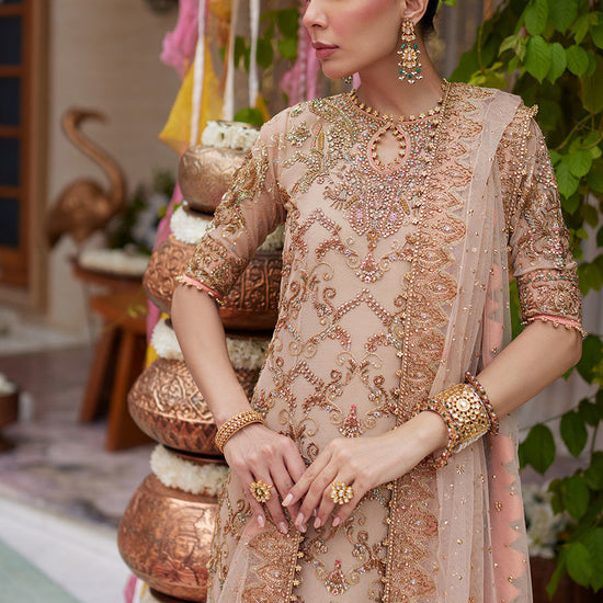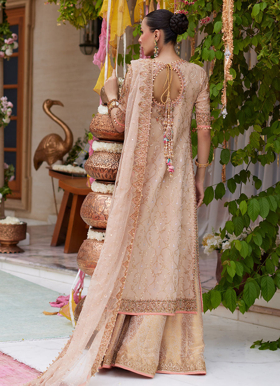 Farah Talib Aziz revisits her core strength of pastel hues, elegant embroideries and delicate modernity to create endlessly covetable designs. Cascading swathes of light gold net come together to form a flowing kalidaar, laden with meticulously hand-worked embellishments in glimmering gold and accent colors. A deliciously sheer pure net dupatta, delicately hand-embellished with a border completes the ensemble. For a subtly glamorous bride, shimmering in rose gold. This show stopping ensemble is complemented with pure silk gold jamawar izaar pants. The coordinating pure net dupatta is heavily embellished with sitara chan made from pearls and sequins. The perfect amalgamation of golds makes this absolutely must-have ensemble.