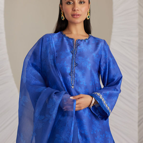 Steal the moment this season and every season that follows with the absolutely stunning Electra ensemble. Cut from pure raw silk with a tonal floral print, this shirt is immaculately tailored to create a contemporary, universally flattering silhouette. The small round neckline adorned with a delicately hand worked embroidery and relaxed kurta-esque silhouette are the ultimate style solution.