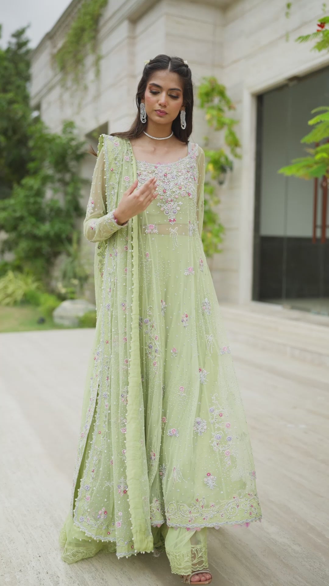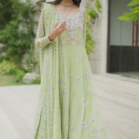 A refreshing statement in kiwi green, this ensemble blends tradition with contemporary grace. The panelled net shirt is brought to life with pastel threadwork, shimmering Swarovski crystals, and delicate pearls, creating a soft yet striking effect. Paired with a zari silk bustier and a flowing net lehnga edged with intricate borders, the silhouette feels both light and opulent. A sheer dupatta completes the look, delicately embroidered and jeweled with crystals and pearls — a modern expression of timeless elegance.